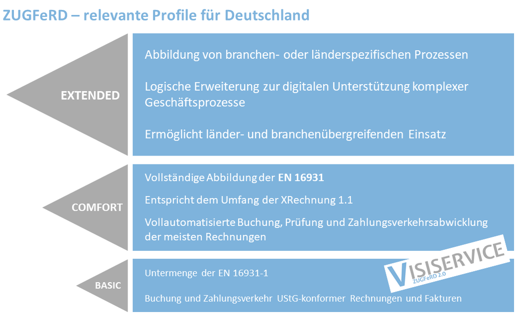 Mit ZUGFeRD 2.0 steht somit ein einheitliches und modernisiertes Datenformat für elektronische Rechnungen zur Verfügung. Es handelt sich um ein hybrides Rechnungsformat, so dass sowohl Sichtkomponenten (PDF) als auch technisch strukturierte Komponenten (A-3 Datei) eine vollautomatisierte Rechnungsverarbeitung zulassen.